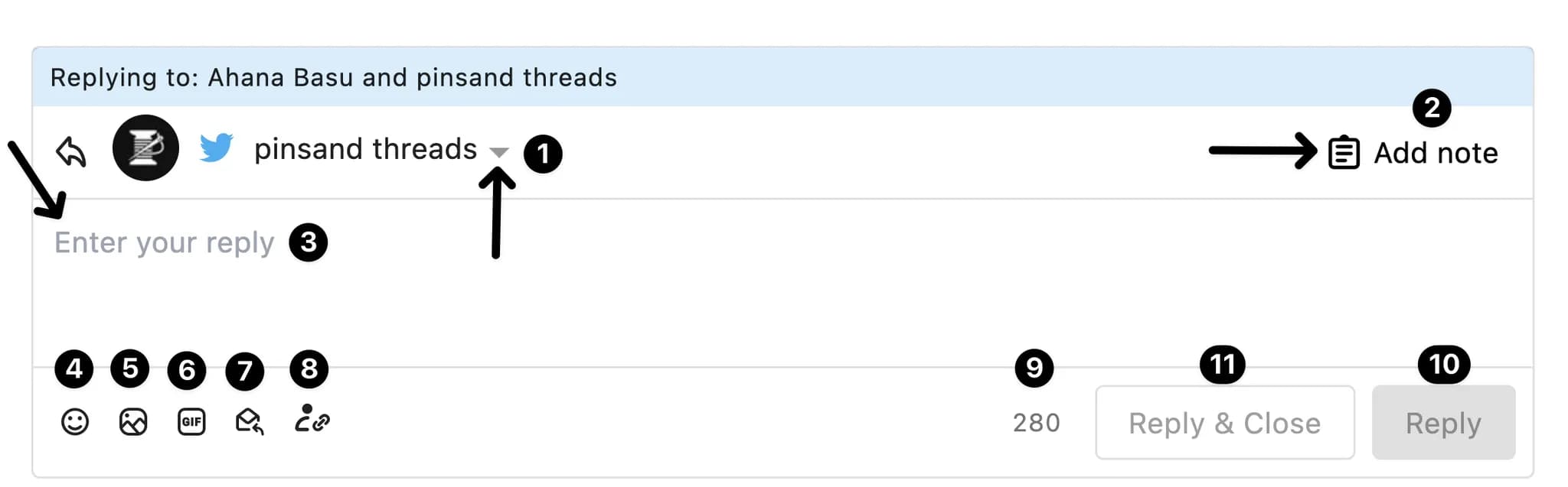 Here, you can type your reply. You can also use @mentions to tag social profiles.