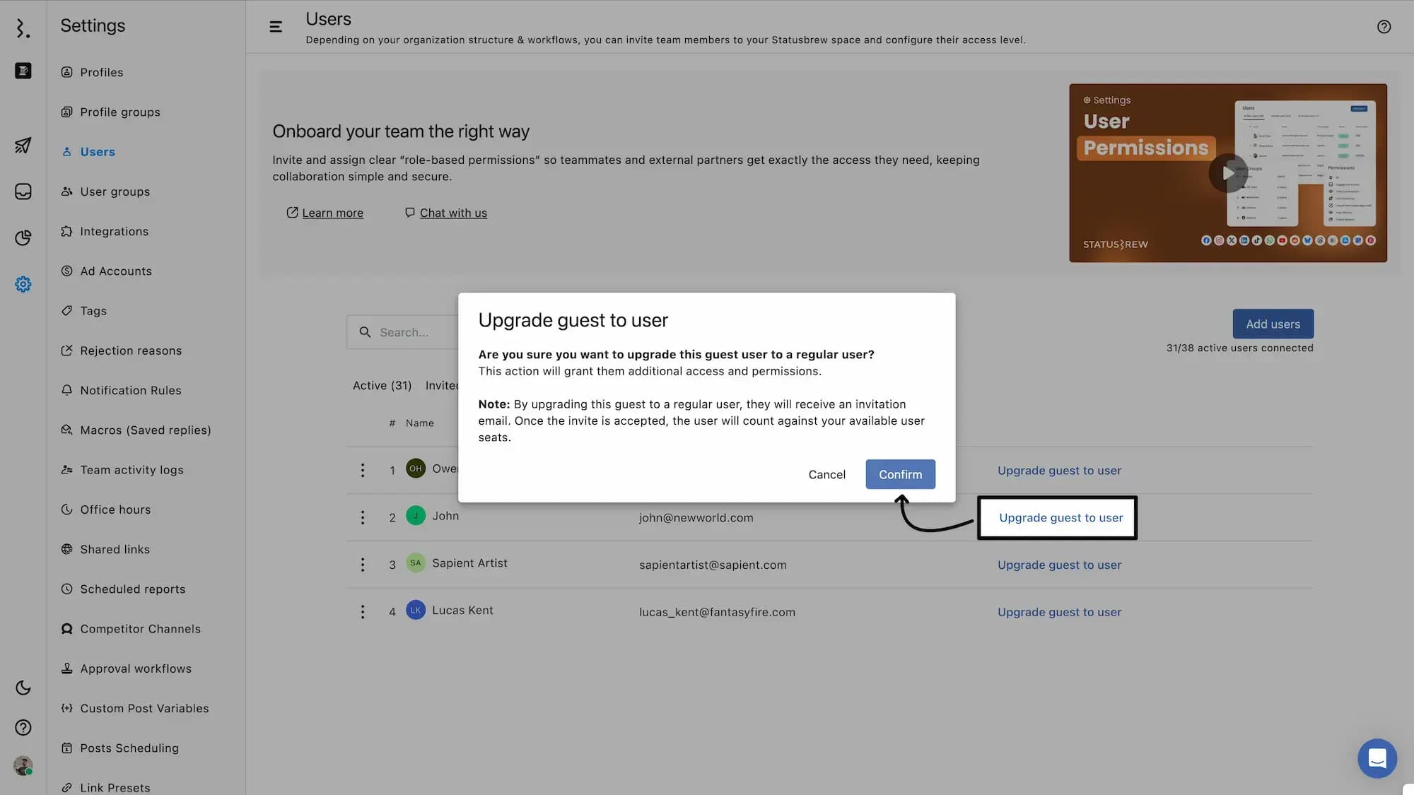 If you want to bring an external approver fully into Statusbrew, click Upgrade guest to user next to their name.
