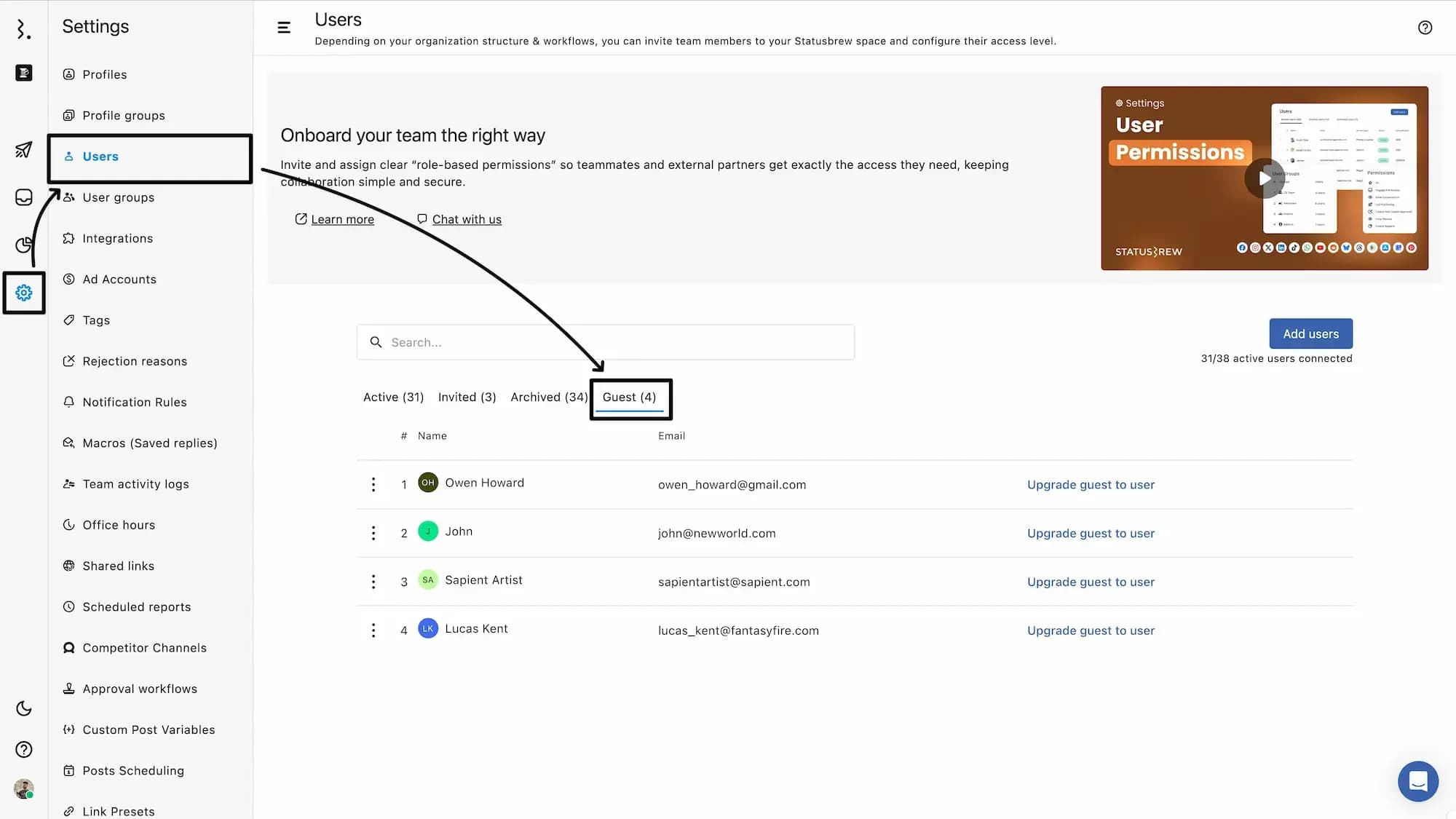 Once you’ve added guest users in Statusbrew, managing them is easy: