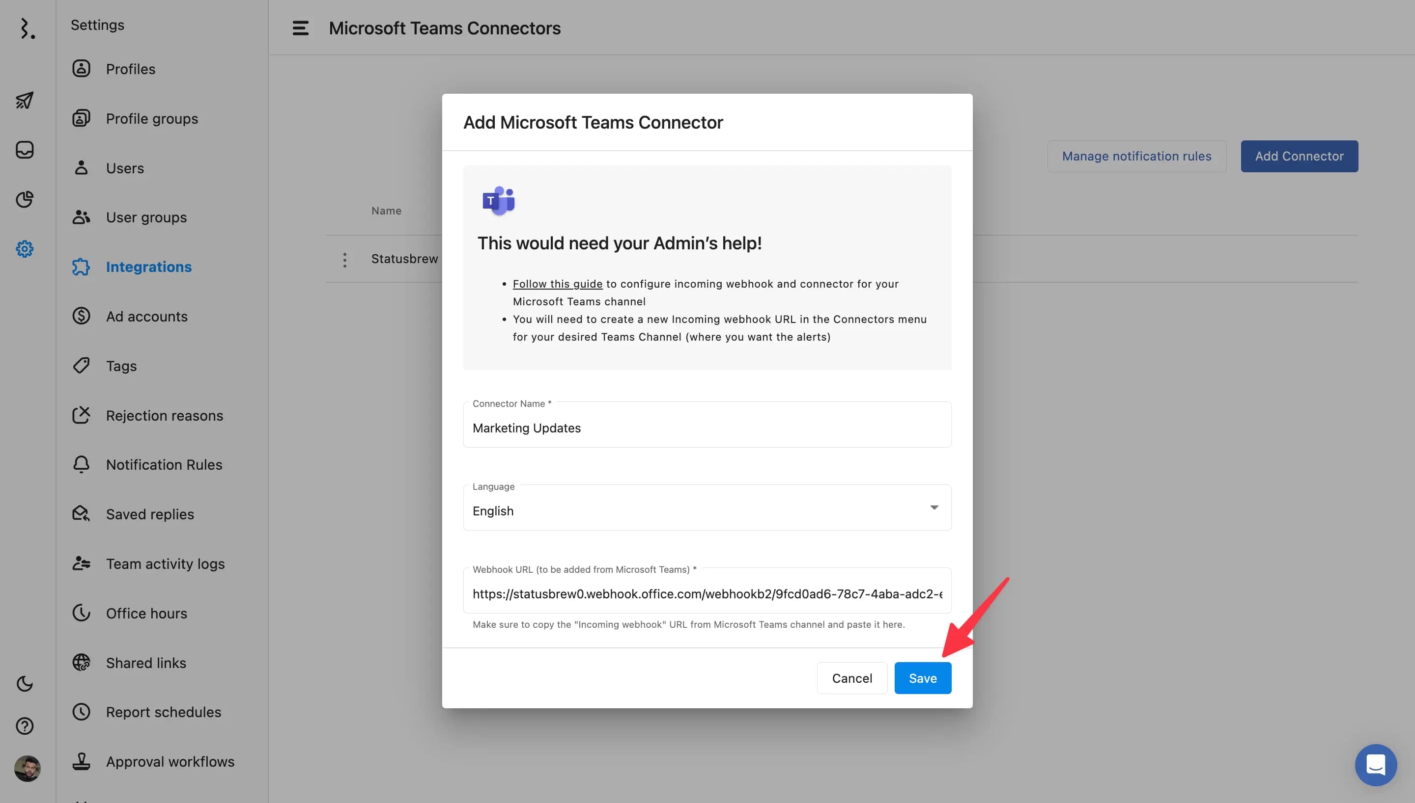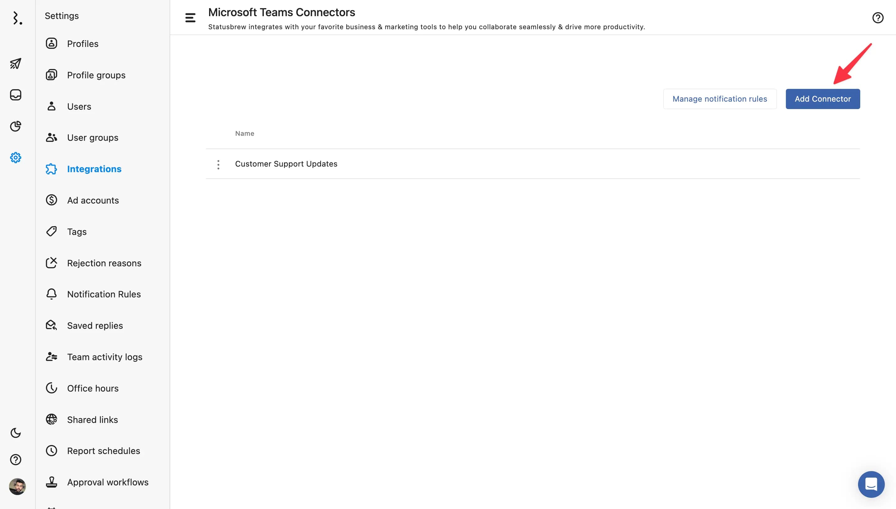 To receive social updates in your Teams Channel, you must first set up a connection between Teams & Statusbrew. Only Statusbrew account owners & admins in Statusbrew can configure this integration.
