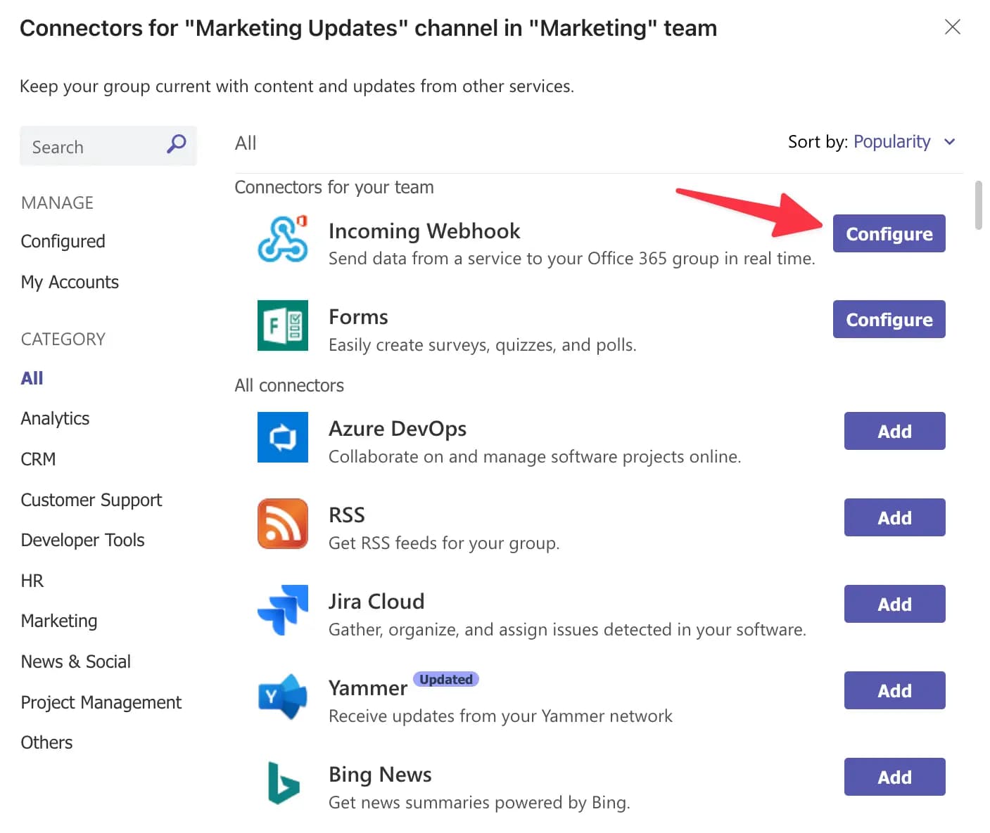 A dialog box will open; you need to click on the Configure button next to Incoming Webhook