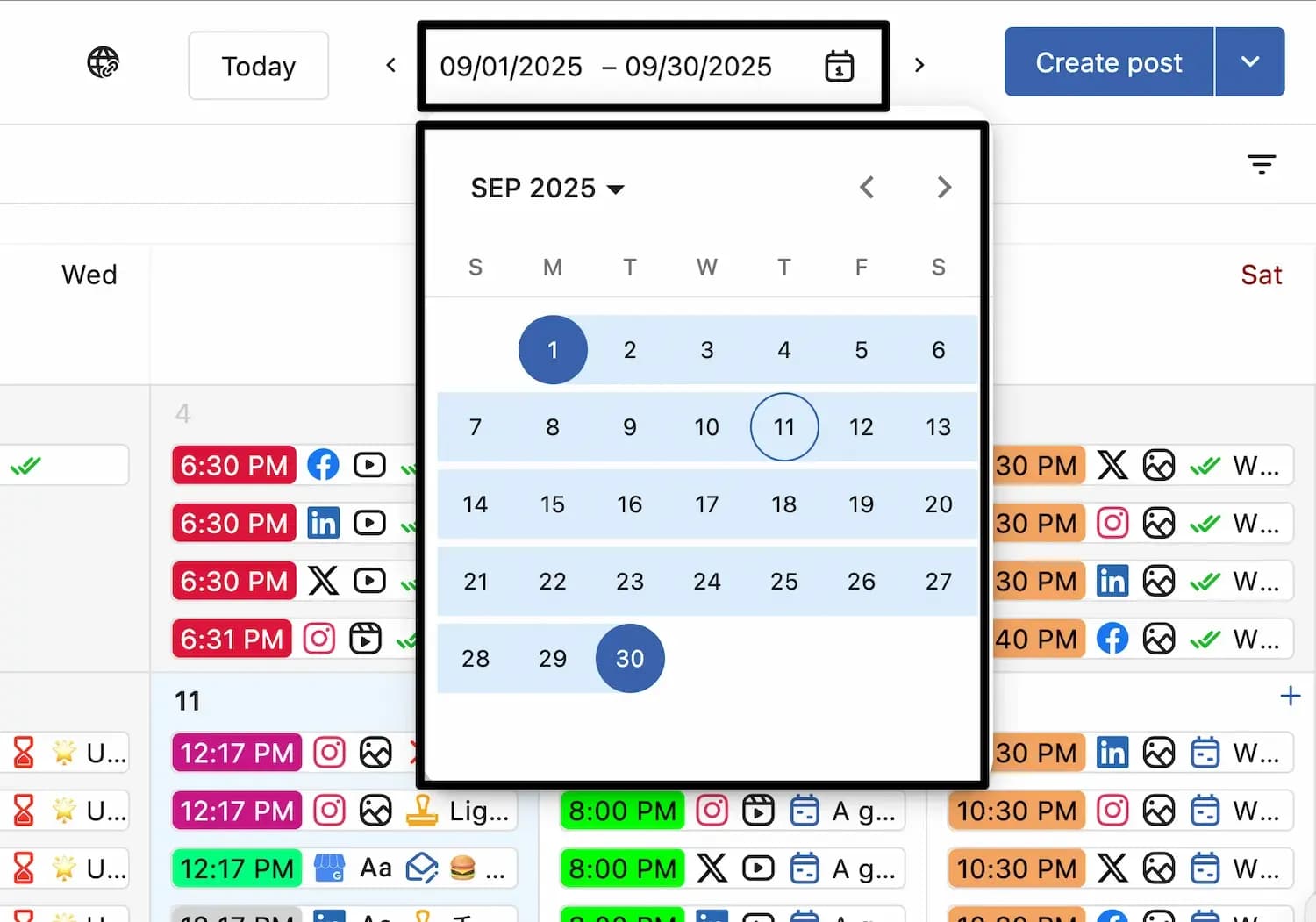 Clicking the Today button will set the date range to start from the current day and display all posts and events within the next 15 days from today.
