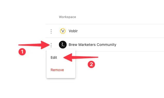 Hover over the workspace for which you want to change the shareability and click on the three dots option beside it