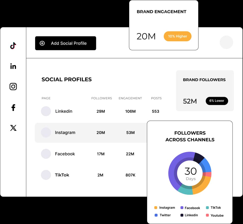 The tool’s cross-channel reporting allows users to view performance metrics across platforms like Instagram, Facebook, X, LinkedIn, and TikTok in a unified dashboard.